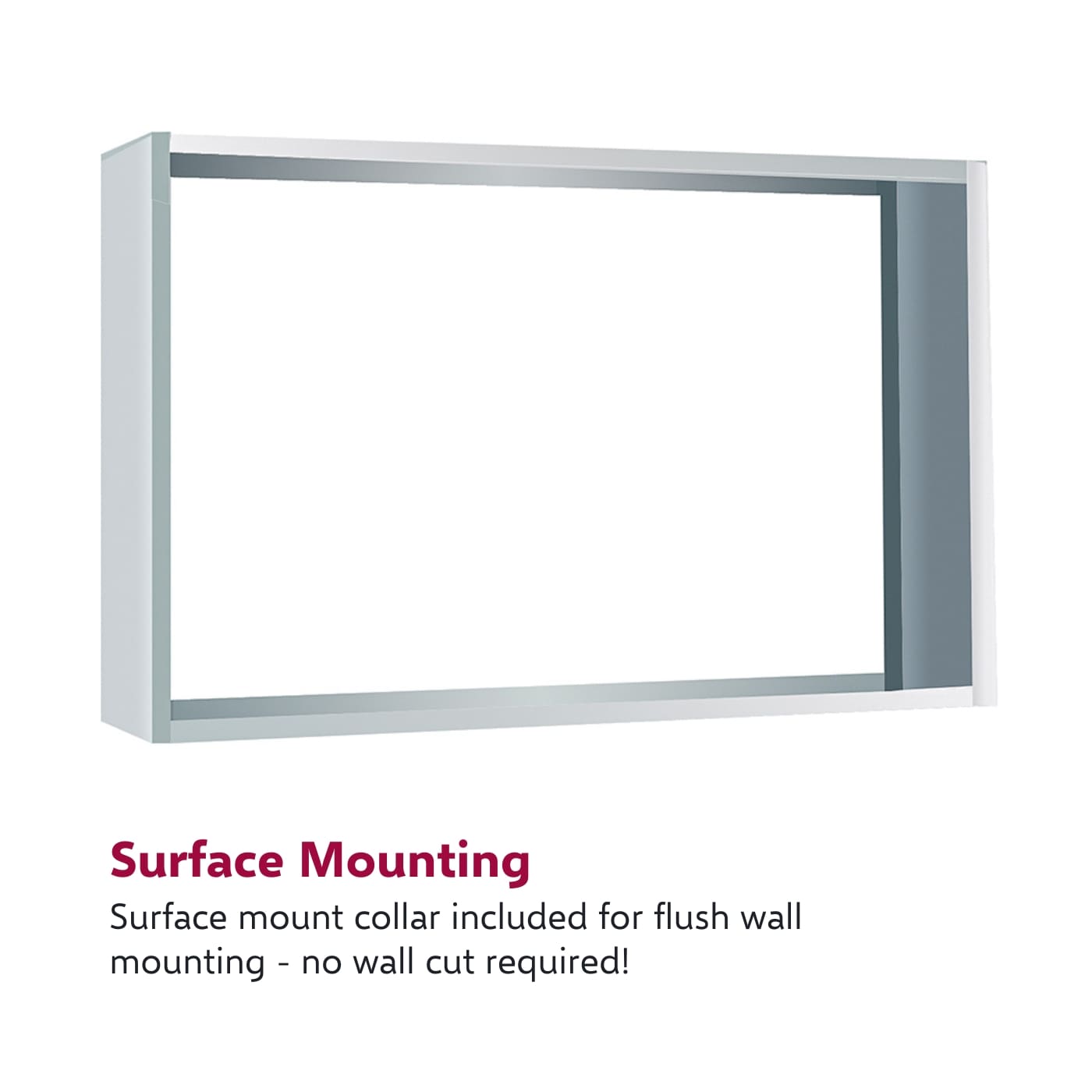 • Top loading with surface mount collar for flush wall mounting – no wall cut required!
