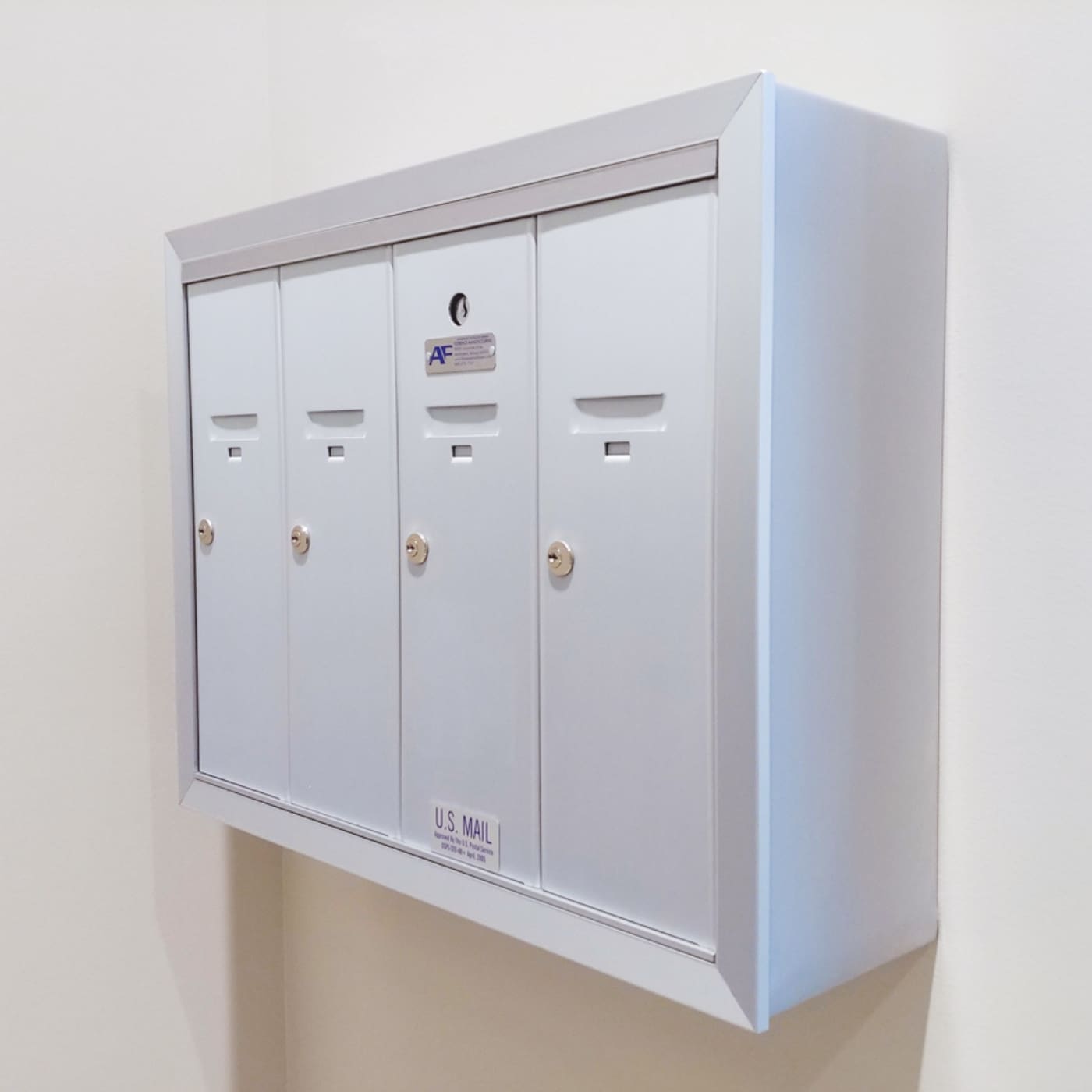 When your mailbox installation location has limited wall depth or walls that are covered in material which makes it difficult to cut a rough opening, our vertical mailbox with surface mount collar offers a solution with a sleek, finished look. Vertical mailboxes are not USPS approved for new installations. The USPS requires properties upgrade to current standards when any remodel or renovation occurs to the property. Any remodel big or small should drive an upgrade to CBU or 4C mailboxes. As these units are top-loading, they should be protected from the weather by installing indoors or under a covered area. Made from heavy-gauge extruded aluminum for durability with striated doors and trim to resist scratches. Five-pin cylinder locks help keep mail contents secure and each compartment features a tenant name card holder.