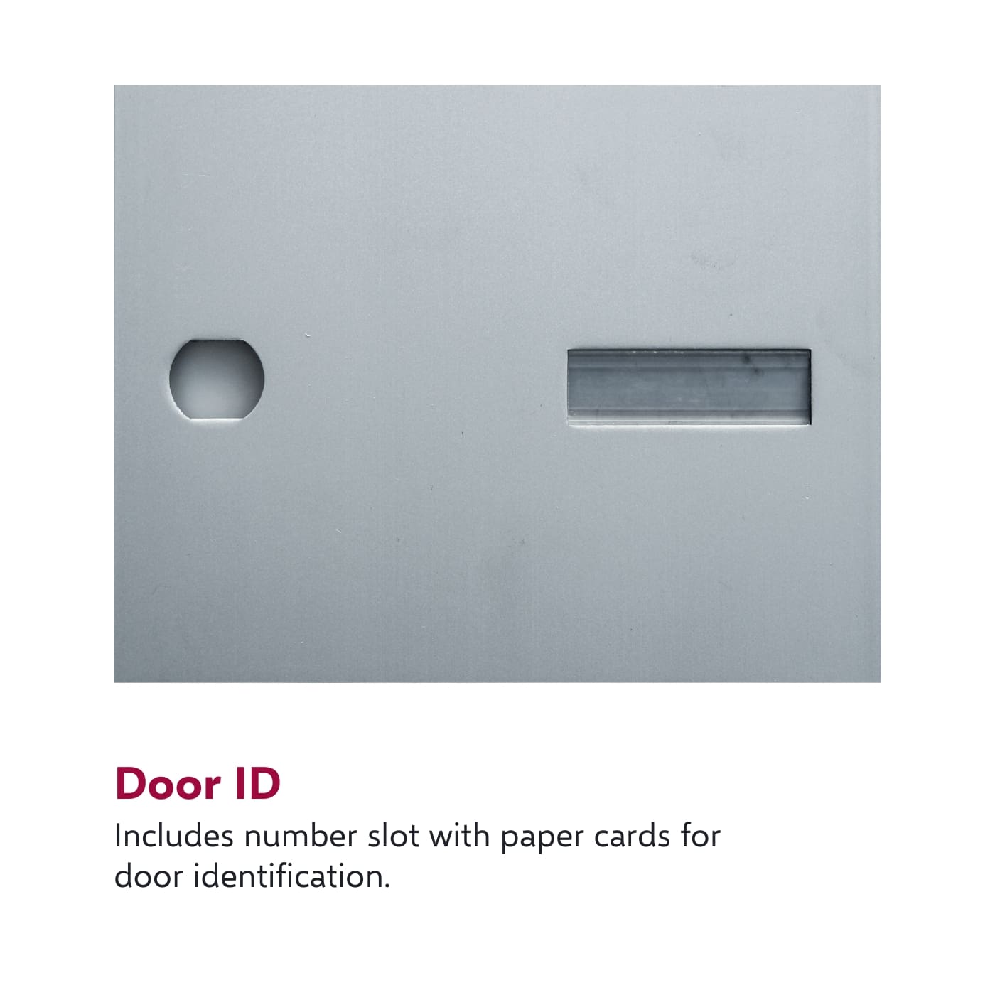 Door ID: Number slot with paper cards for identification. Each tenant door includes clear plastic window with metal backplate and card for tenant number identification and labeling in the field.