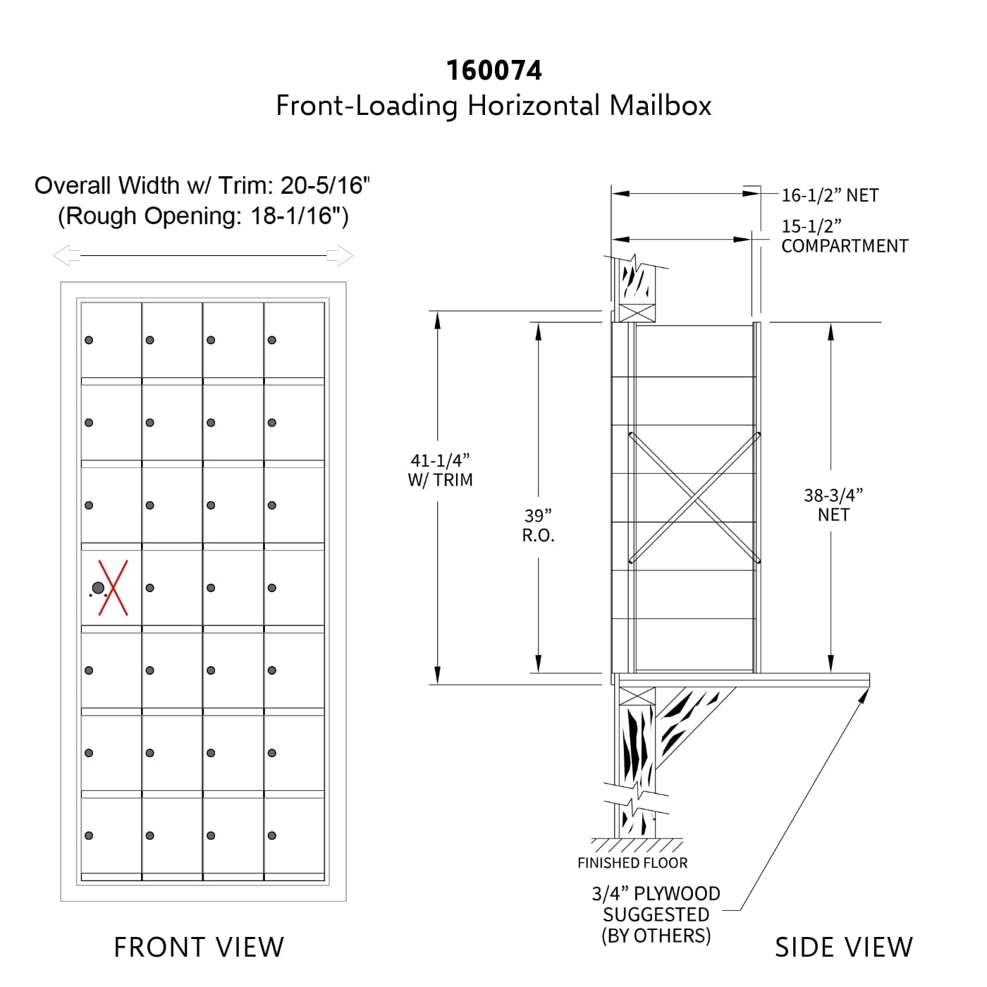 • Horizontal mailbox unit is 7 doors high and 4 doors wide – one compartment reserved for private master lock