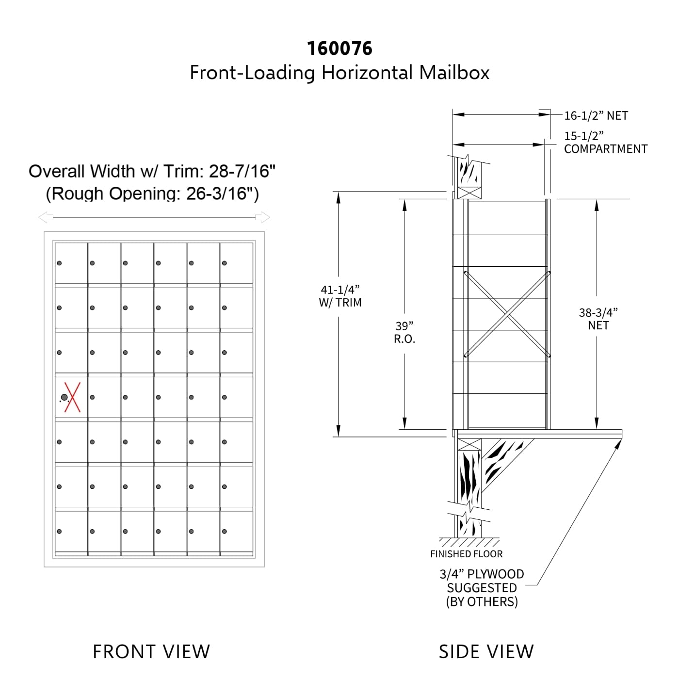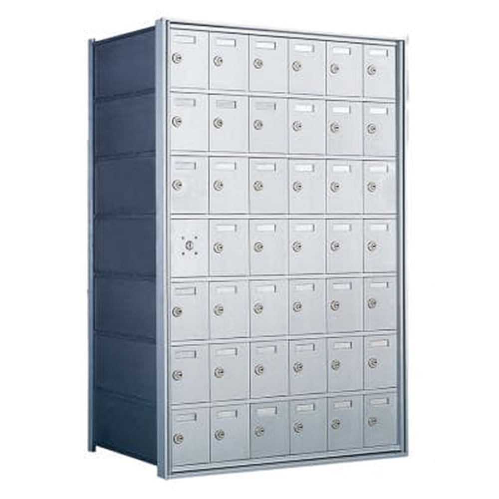 • Horizontal mailbox unit is 7 doors high and 6 doors wide – one compartment reserved for private master lock
