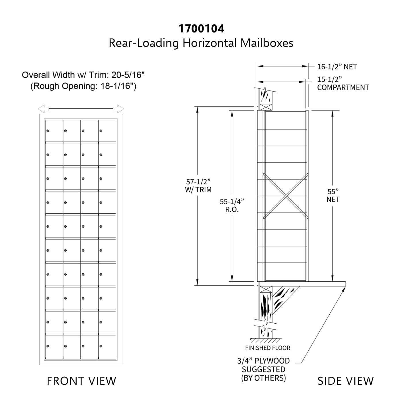 • Horizontal mailbox, front load with 40 doors, rear load, fully recessed