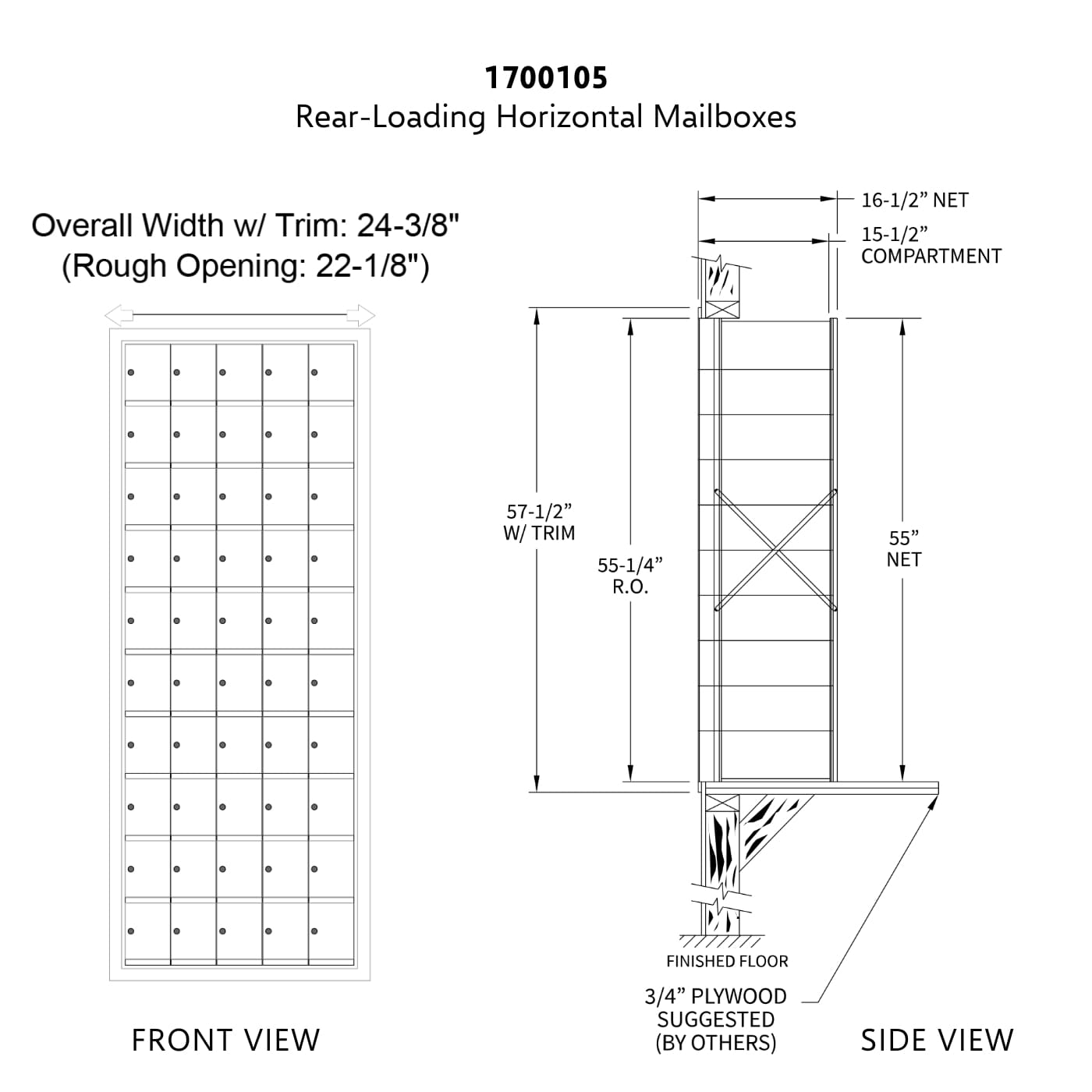 • Horizontal mailbox, front load with 50 doors, rear load, fully recessed