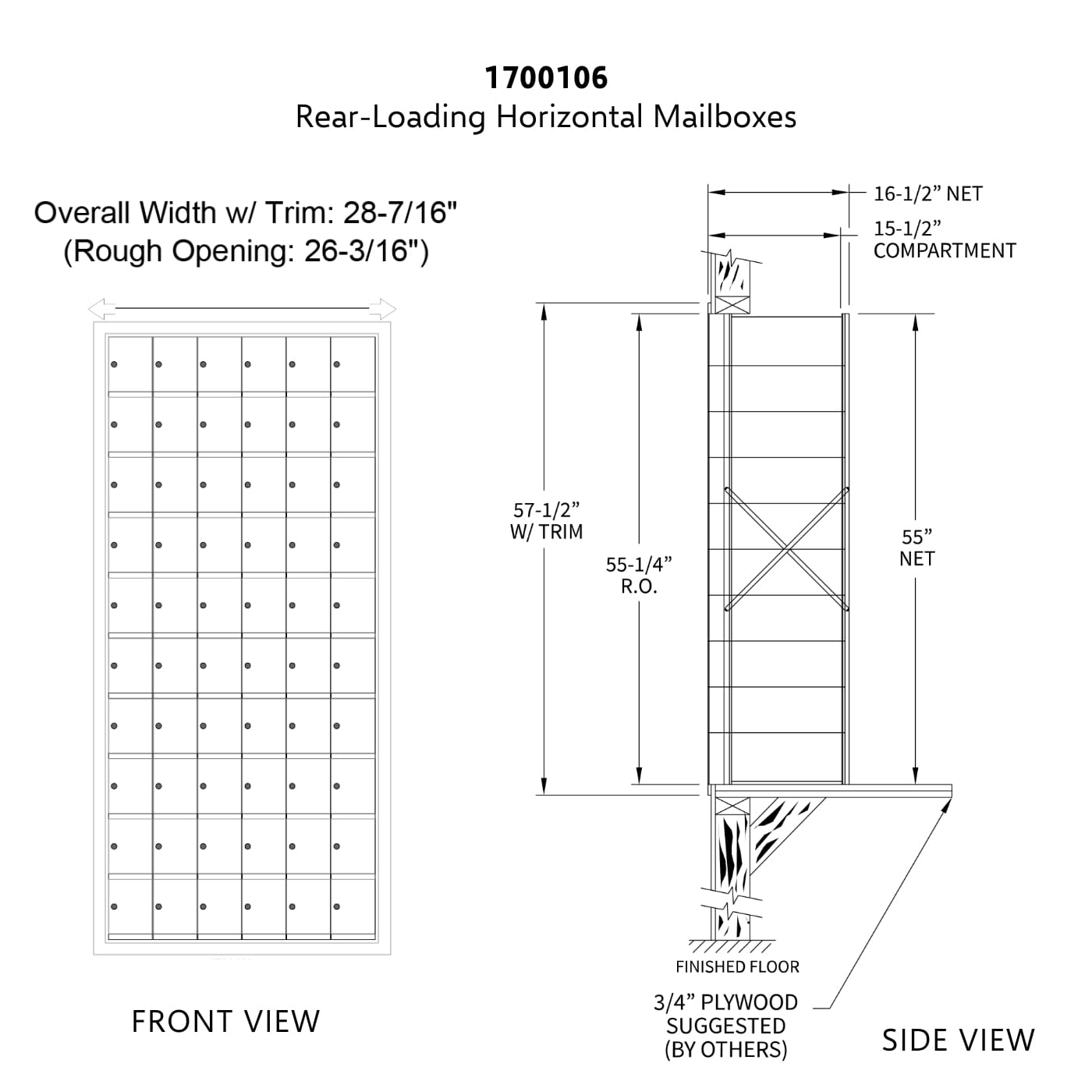 • Horizontal mailbox, front load with 60 doors, rear load, fully recessed