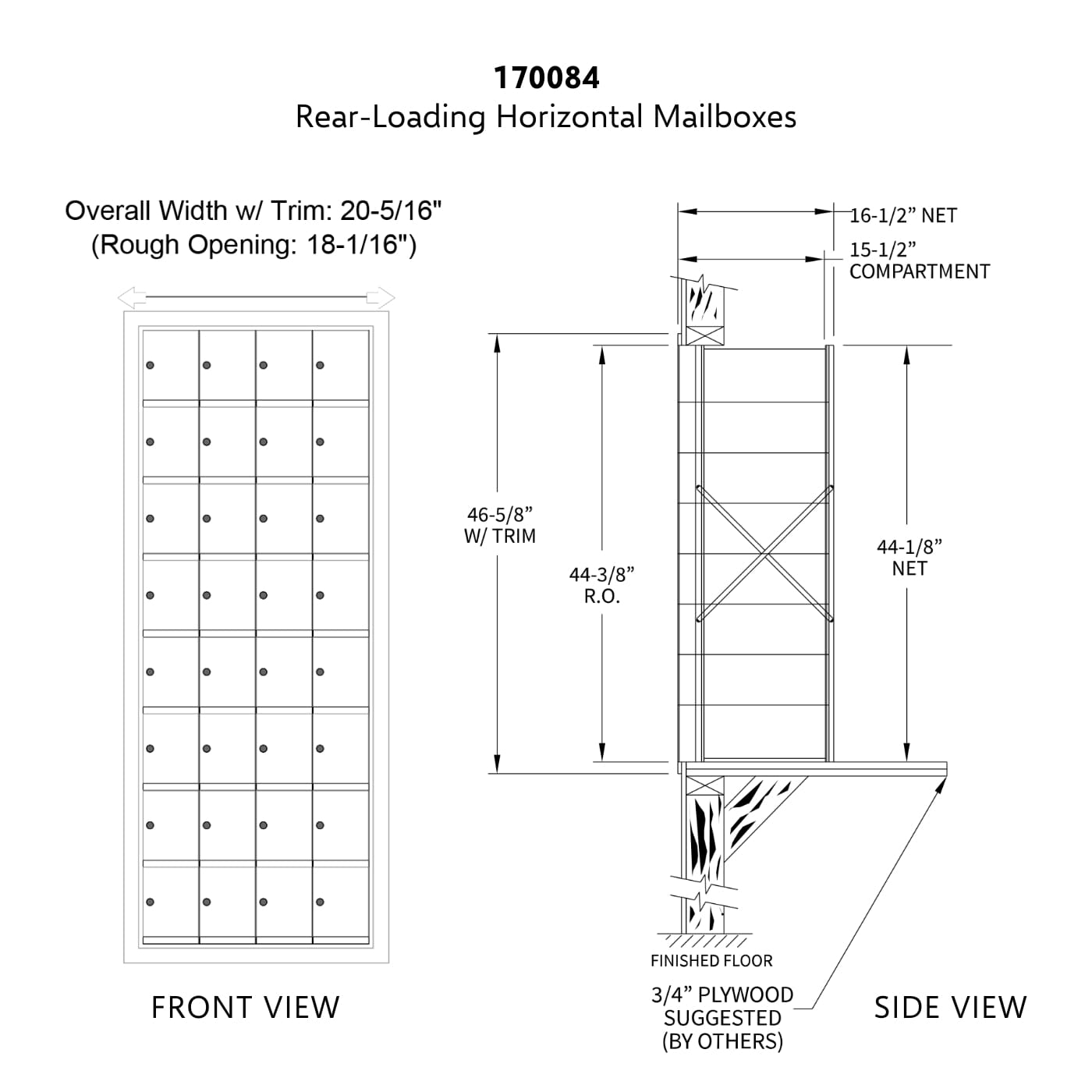 • Horizontal mailbox, front load with 32 doors, rear load, fully recessed