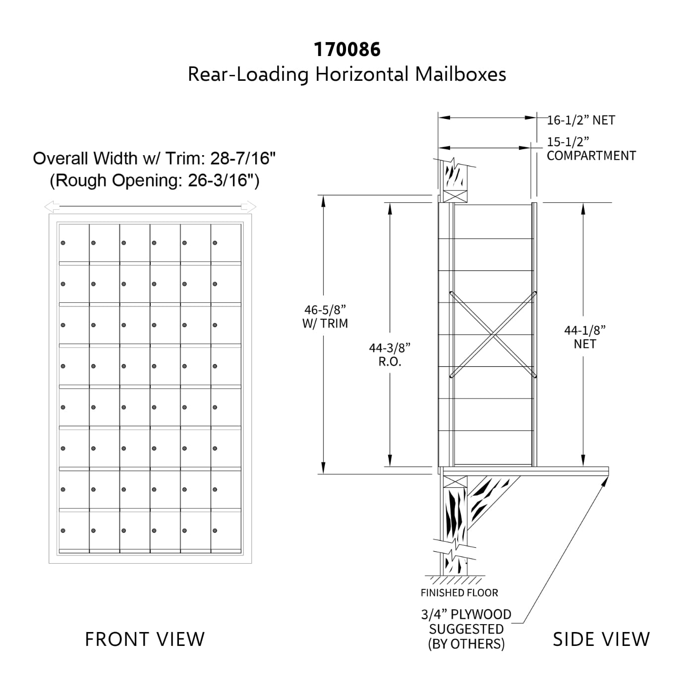 • Horizontal mailbox, front load with 48 doors, rear load, fully recessed