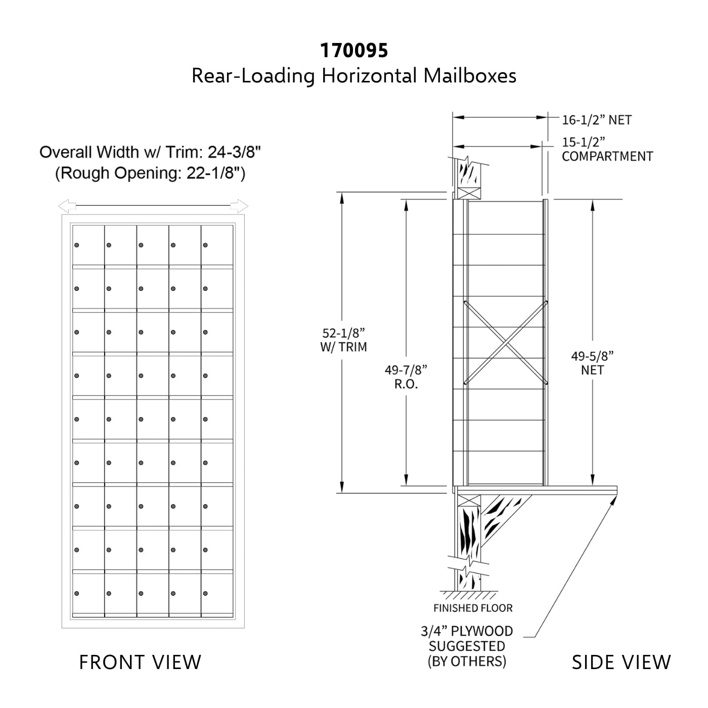 • Horizontal mailbox, front load with 45 doors, rear load, fully recessed