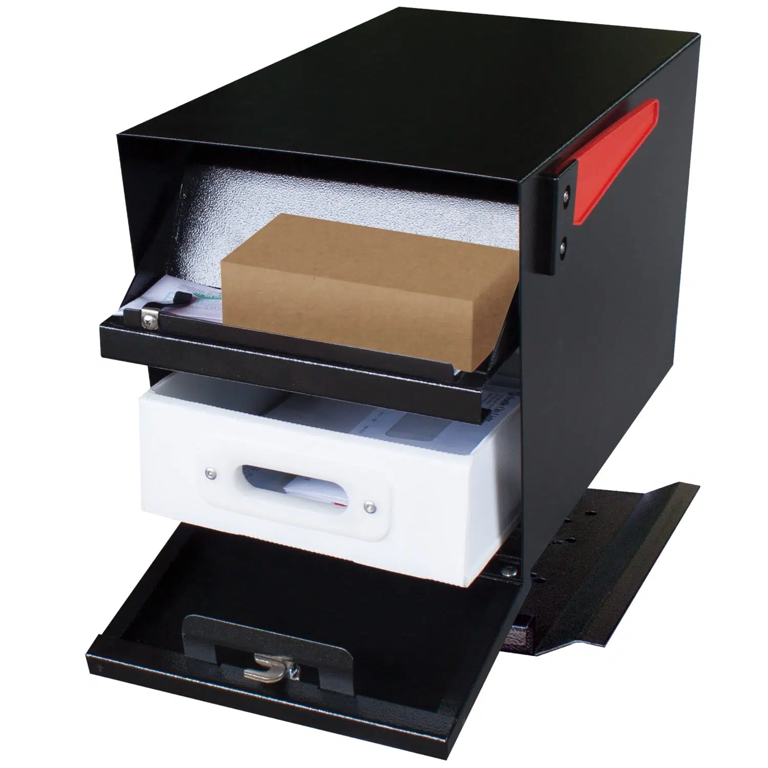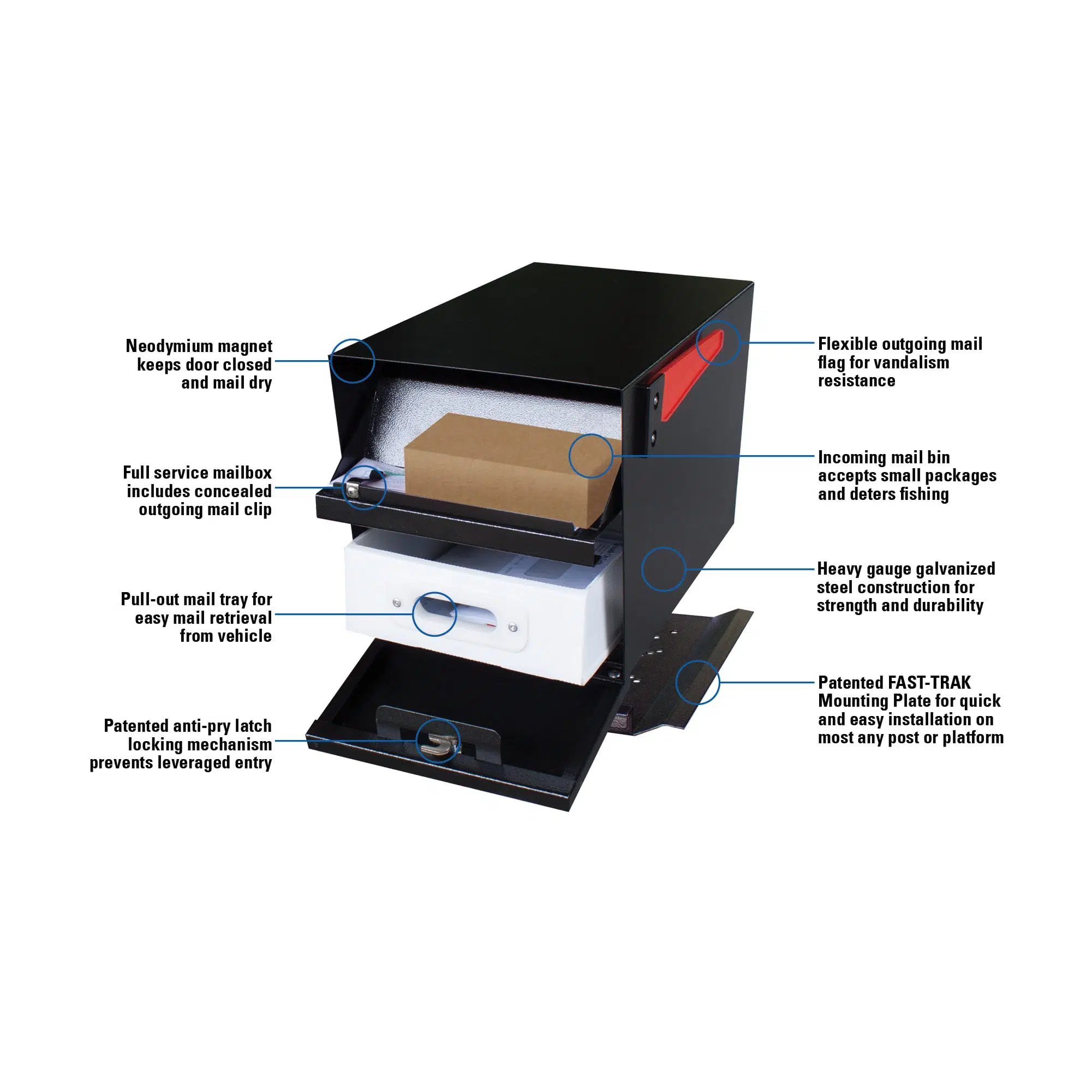 • Includes flexible UV and vandal resistant flag, 3 keys, pull out mail tray & installation hardware