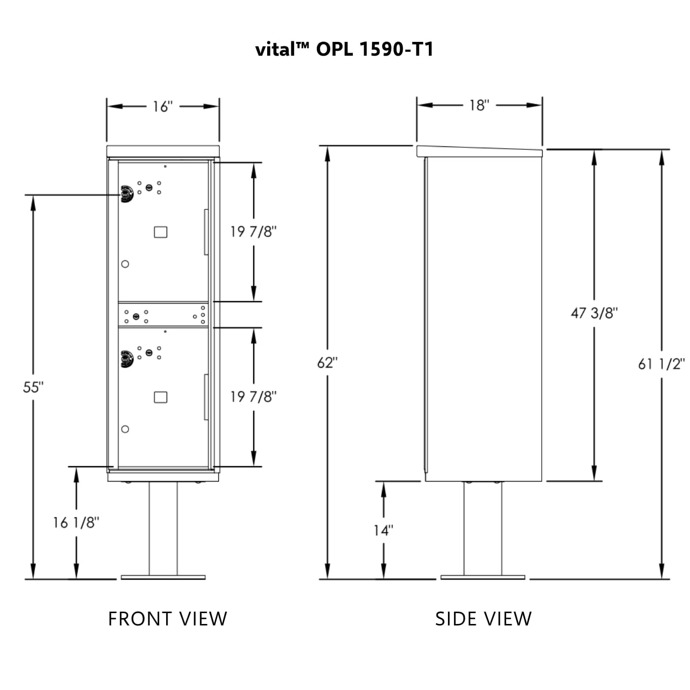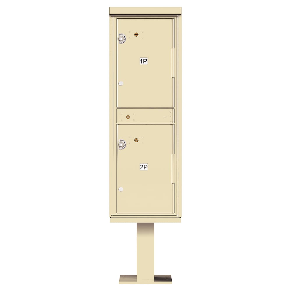 - Front loading, pedestal mounted OPL parcel locker unit includes a carrier access door prepared for a USPS arrow lock (installed by local postal officials)