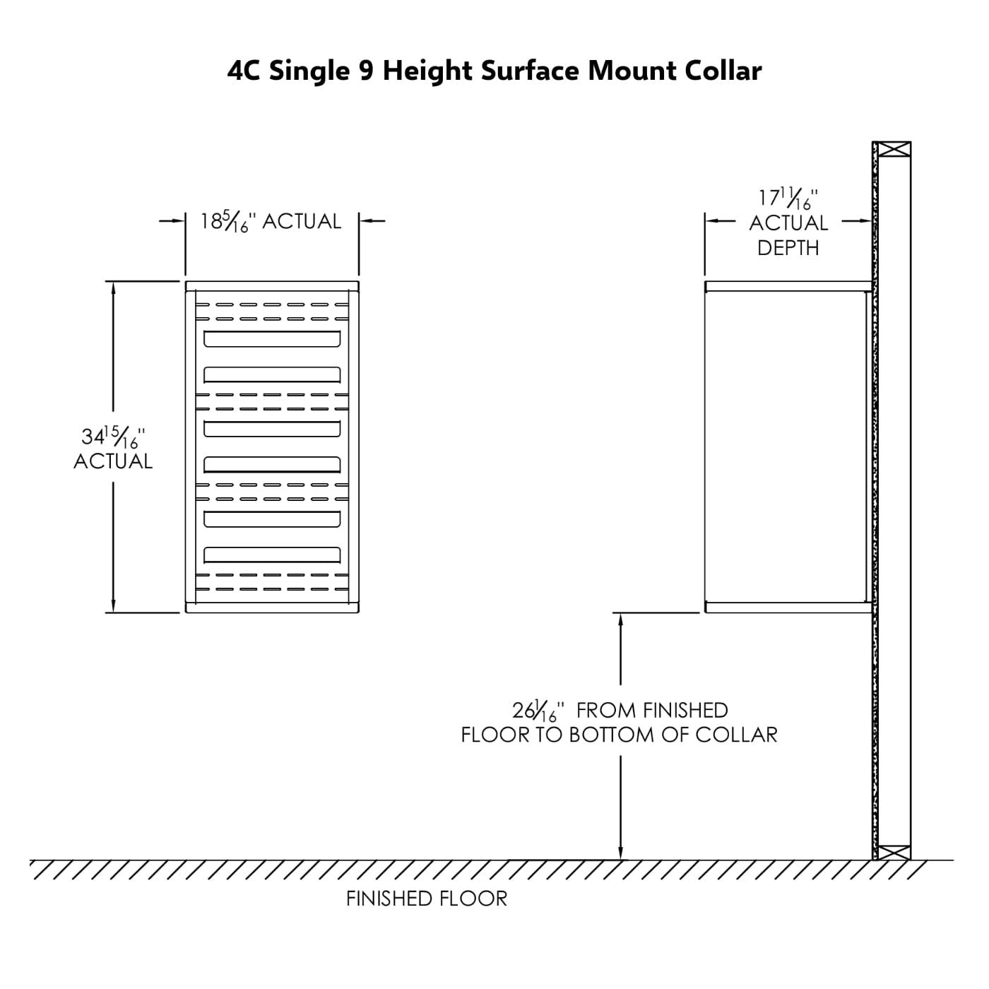 Ideal for settings with limited wall depth, this solution provides greater flexibility in mailbox placement and installation. This heavy-duty STD-4C mailbox enclosure allows standard modules to quickly and easily be mounted to any flat surface. The easy-to-assemble collar has an industry exclusive slotted back design for ease in installation and reduction of overall unit weight. Surface mounted 4C units should be installed indoors or under a weather protected cover outdoors.
