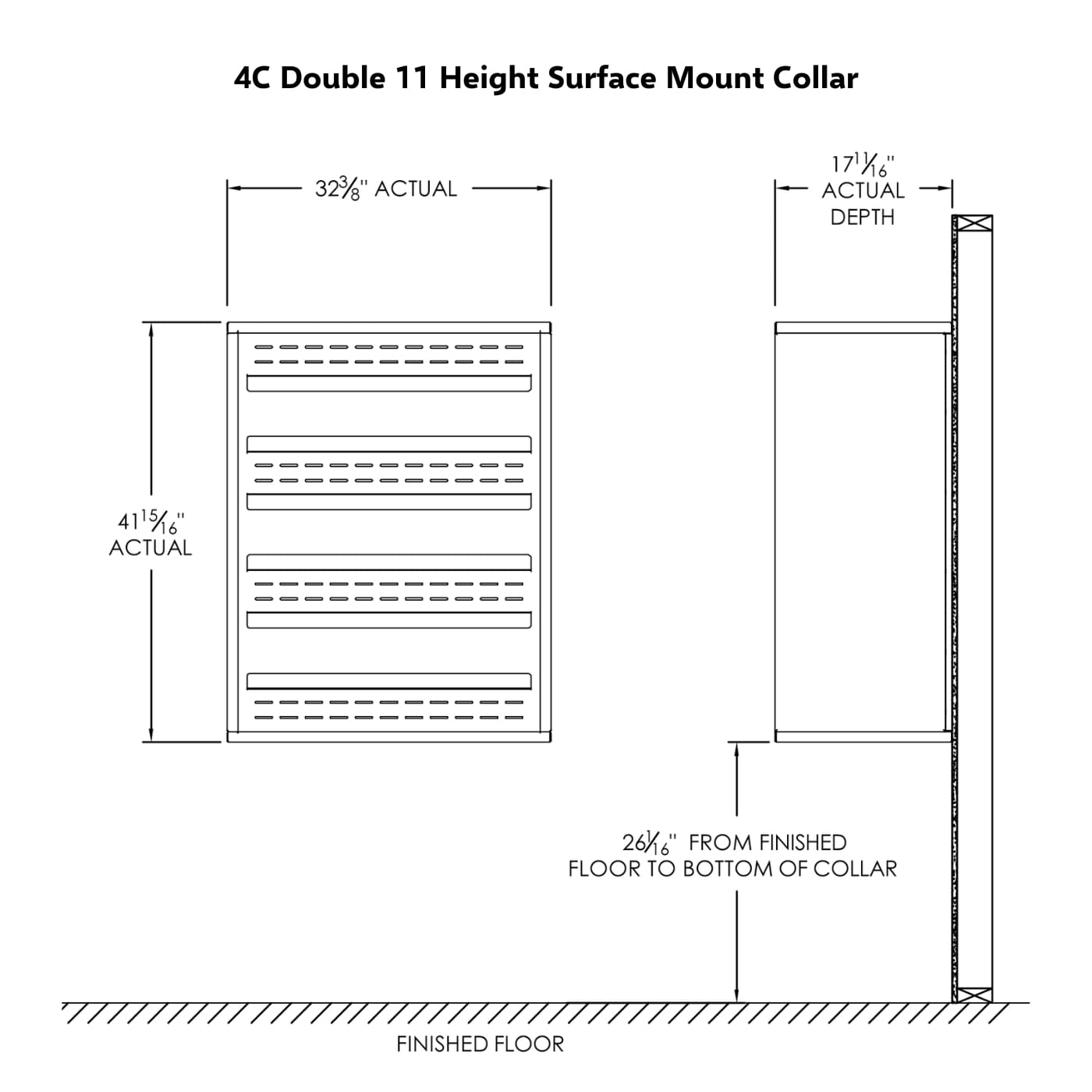 Ideal for settings with limited wall depth, this solution provides greater flexibility in mailbox placement and installation. This heavy-duty STD-4C mailbox enclosure allows standard modules to quickly and easily be mounted to any flat surface. The easy-to-assemble collar has an industry exclusive slotted back design for ease in installation and reduction of overall unit weight. Surface mounted 4C units should be installed indoors or under a weather protected cover outdoors.